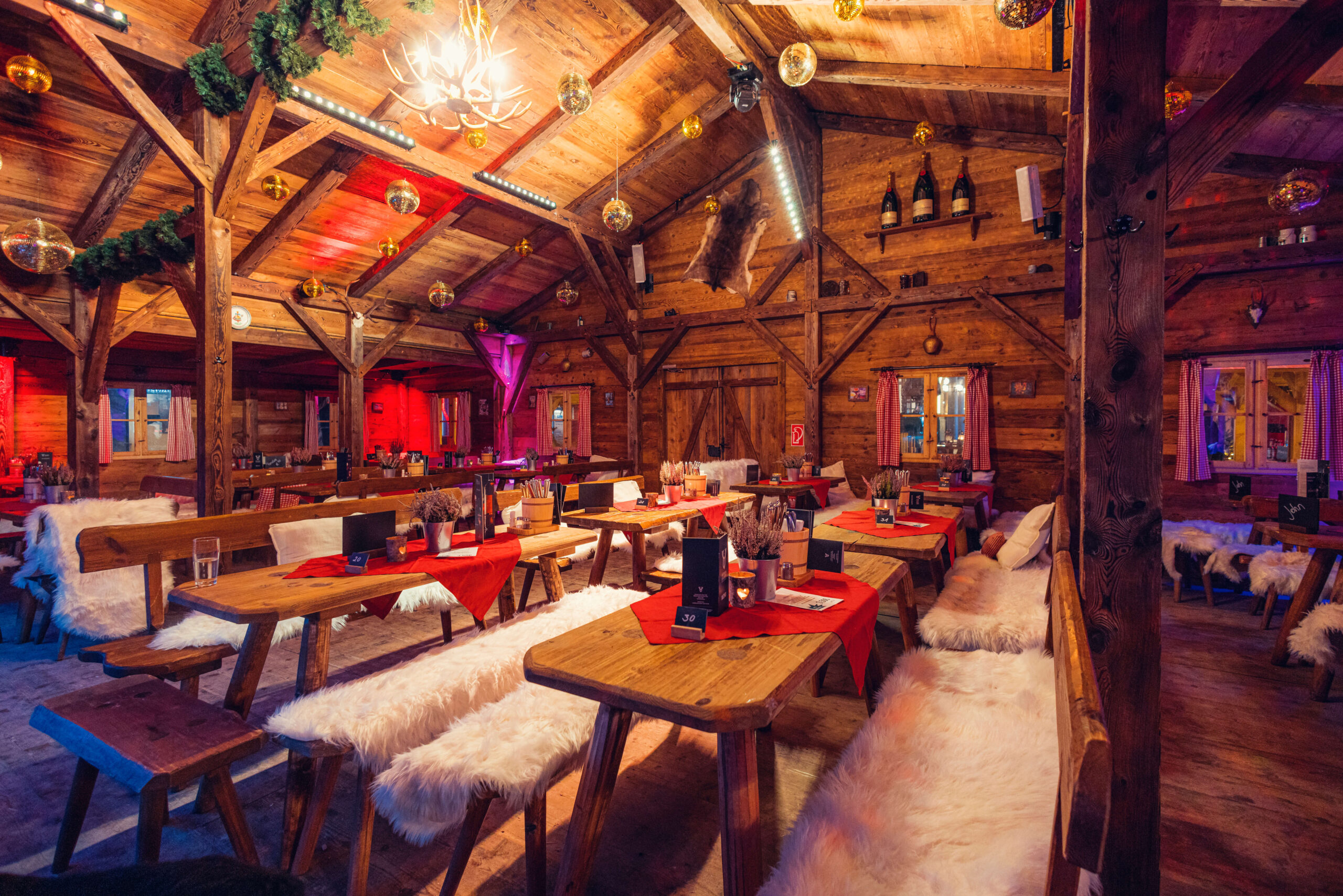 Du kannst unsere rustikale Almhütte auch für die nächste Weihnachts- oder Firmenfeier buchen. Die exklusive Hütte bietet Platz für bis zu 150 Personen.